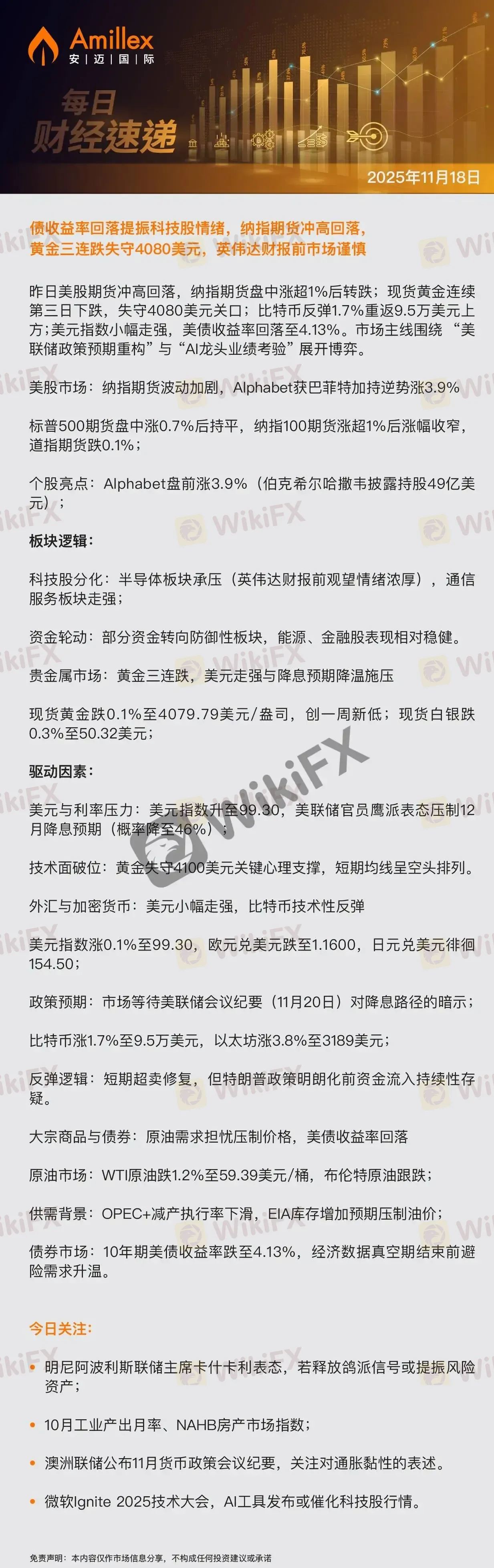 Amillex每日汇评:美债收益率回落提振科技股情绪,纳指期货冲高回落,黄金三连跌失守4080美元,英伟达财报前市场谨慎
