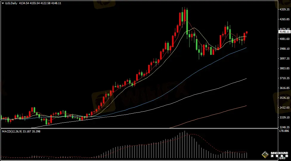 金价4小时图看,金价布林带张口再度打开,金价振荡上涨至布林上轨上方运行;短期均线EMA5与EMA10形成多头向上,MACD指标动能柱转为正值并逐步增加,RSI指标上升至62位置附近运行。日内短线操作建议,估计金价在4132-4158区间振荡运行,如突破该区间时,上行目标看4165、或4175附近;下行目标看4115、或4105附近。