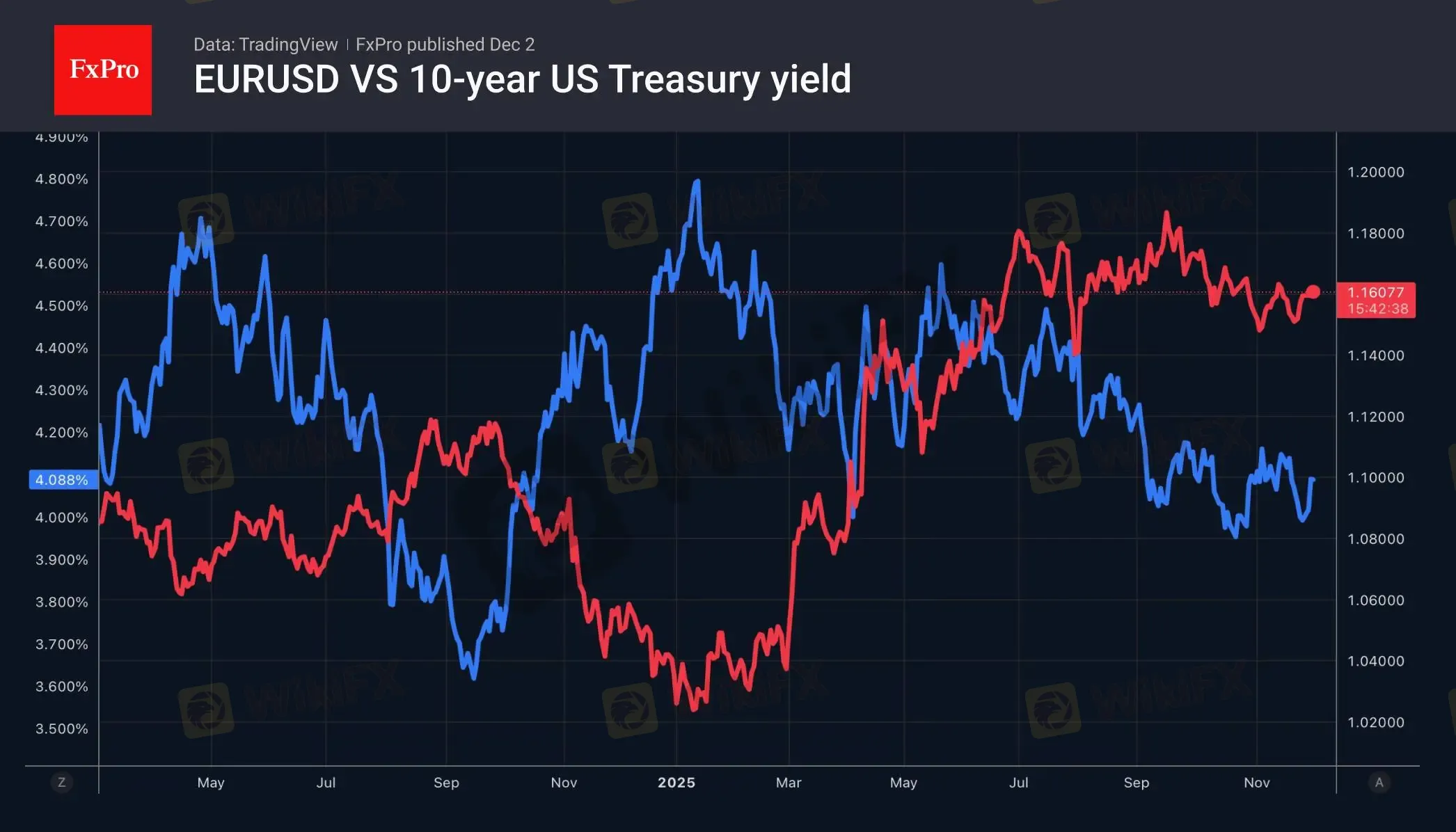 欧元兑美元(EURUSD)这一主要货币对从两周高点回落,核心原因是 10 年期美国国债收益率反弹至 4% 上方。投资者担忧,持有 1.2 万亿美元美国国债的日本,随着本土资产吸引力提升及资金回流,可能启动大规模美债抛售。而日本央行行长植田和男近期释放的鹰派信号,进一步强化了市场对 12 月加息的预期,这一预期成为美债抛售担忧的重要支撑。连锁反应下,10 年期日本国债收益率已飙升至 2008 年金融危机以来的最高水平,日元资产吸引力持续增强。