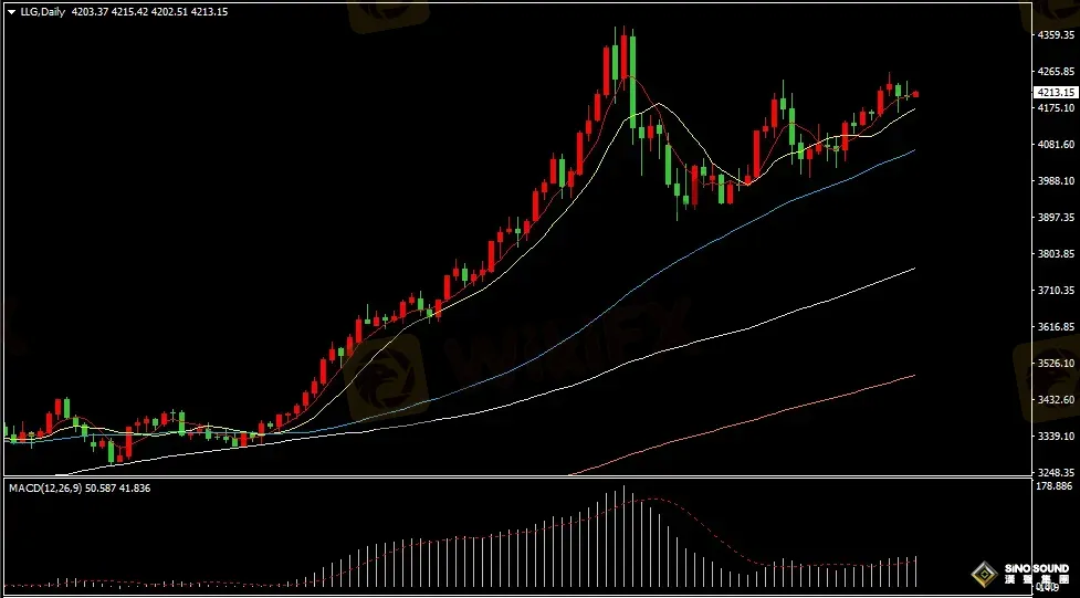 金价日线图看,昨晚金价再度冲高回落,显示金价在4240美元关口附近存在阻力压制,金价重新回到5日均线盘整。短线看,多空双方在4200美元关口附近博弈相对激烈。日线指标看,5日与10日均线维持多头排列,MACD指标正动能柱相对持续,RSI指标在62位置附近持续徘徊。