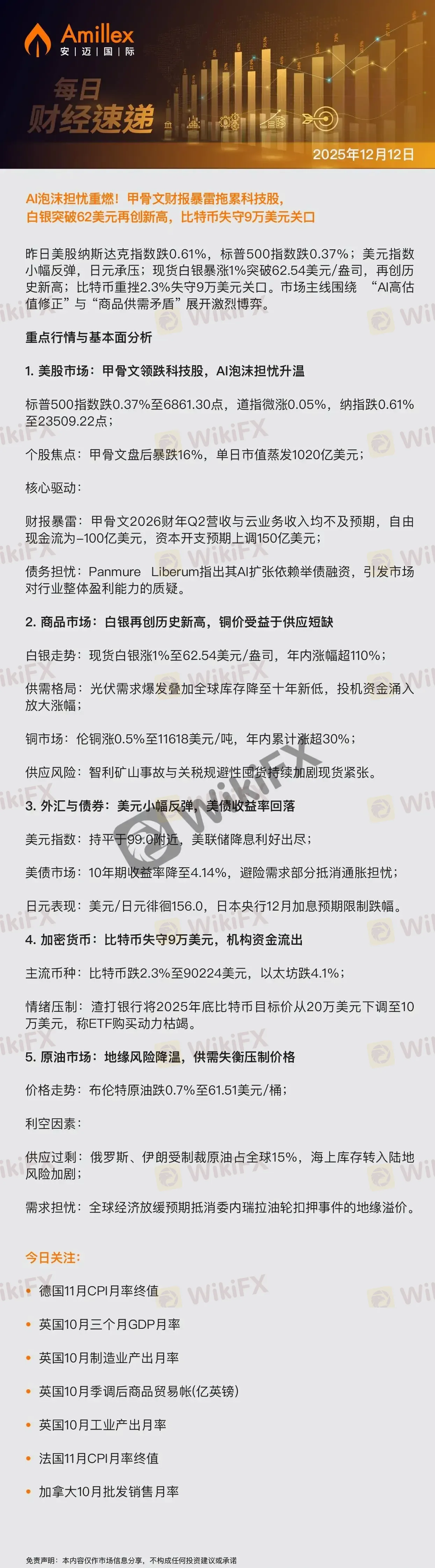Amillex每日汇评:AI泡沫担忧重燃!甲骨文财报暴雷拖累科技股,白银突破62美元再创新高,比特币失守9万美元关口