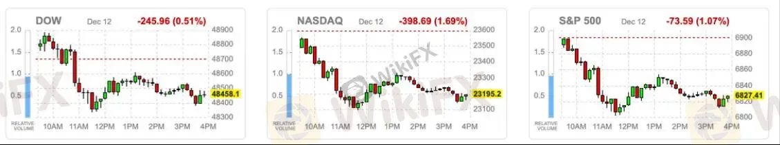 科技板块承压最重:跌幅集中在半导体与硬件产业链。费半大跌反映即便博通公布优于预期的财报与 AI 订单能见度,仍难以满足市场对后续收入增长和毛利率的高预期,进而拖累美光(MU)、超微(AMD)、英伟达(NVDA)等 AI 半导体与数据中心相关个股同步回调。