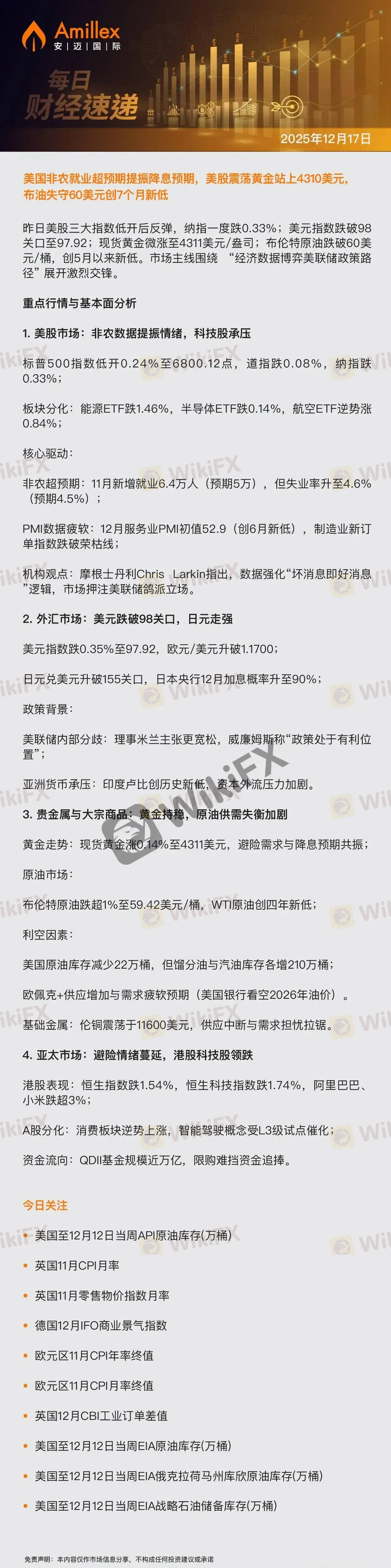 Amillex每日汇评:美国非农就业超预期提振降息预期,美股震荡黄金站上4310美元,布油失守60美元创7个月新低