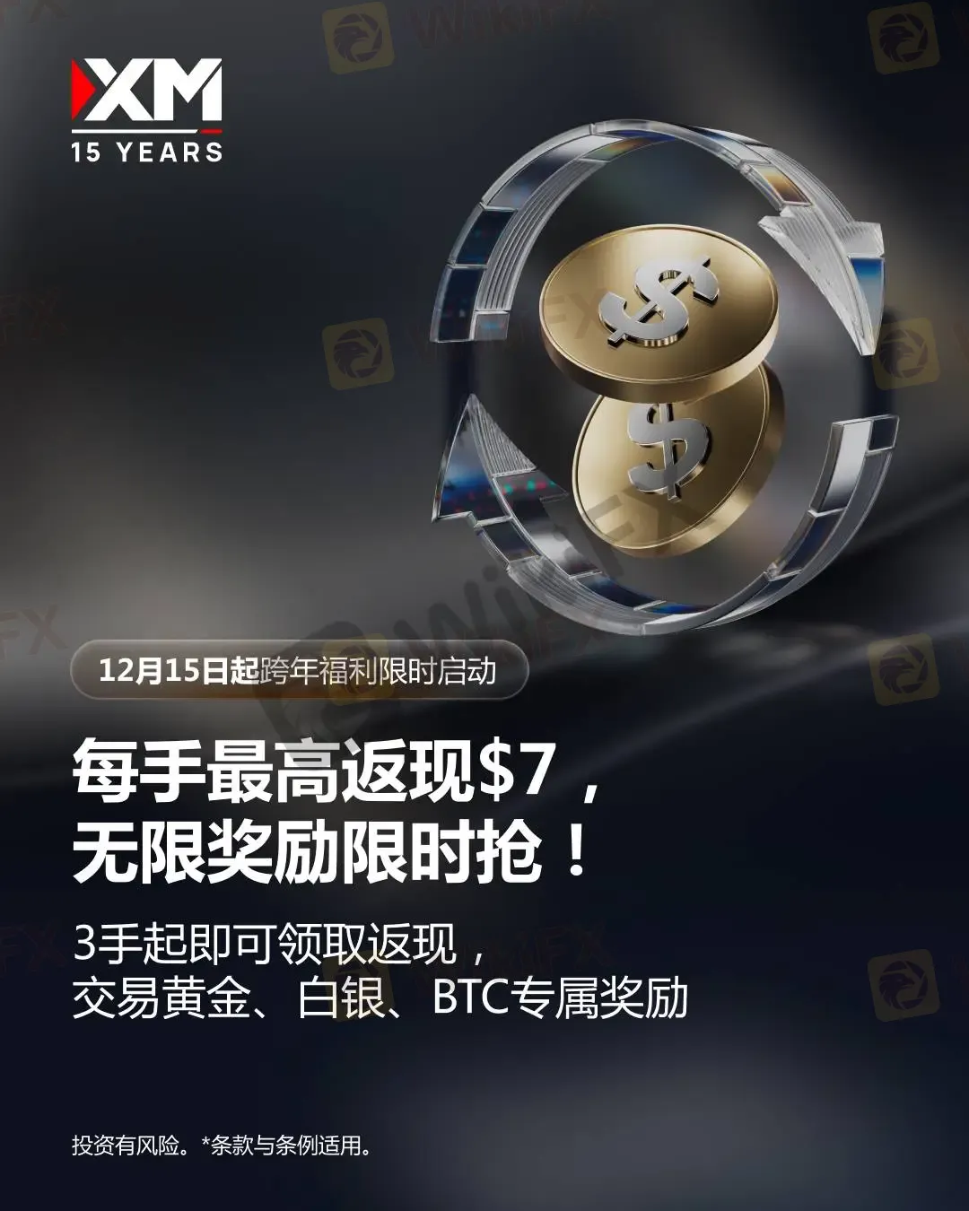 为年末交易注入活力,XM欢庆15周年给全球交易员送限时福利——黄金、白银、BTC交易从3手起即可领取返现,最高每手$7返现奖励无上限!