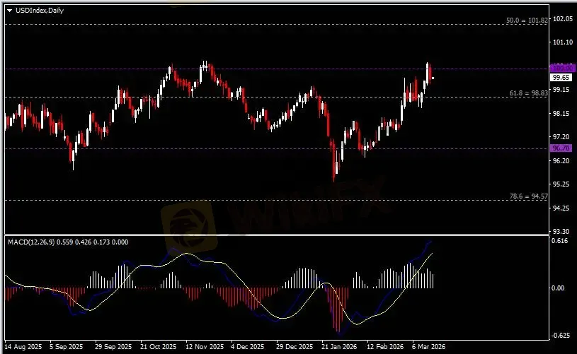 日线图显示美元指数遇阻回调,当前承压于100关键阻力。从MACD来看,快慢线向上运行,白色动能柱则温和收缩。指数走势基本和动能柱的变化一致。