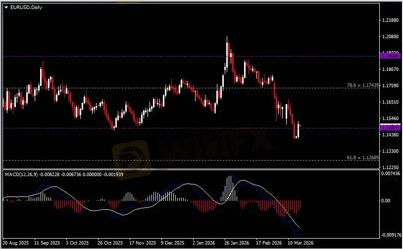 日线图显示欧元兑美元低位反弹,当前收于前高1.1480。从MACD来看,快慢线呈拐向,红色动能柱温和收缩。汇价走势基本和动能柱的变化一致。