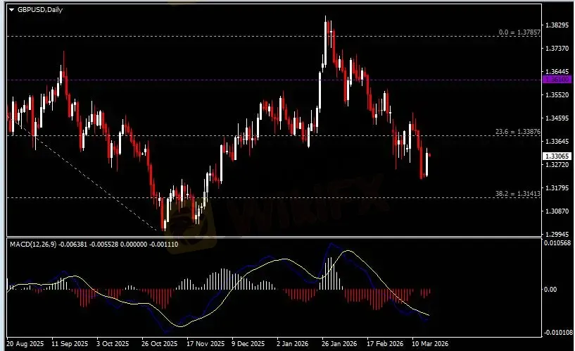 日线图显示英镑兑美元反弹上行,当前承压于1.3390阻力。从MACD来看,快慢线呈拐向,红色动能柱温和收缩。汇价走势基本和动能柱的变化一致。