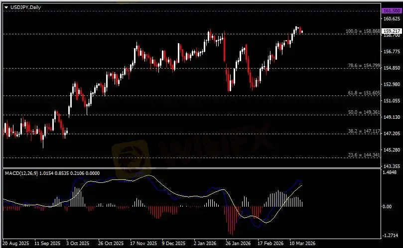 日线图显示美元兑日元高位回调,当前测试158.90支撑。从MACD来看,快慢线呈拐向,白色动能柱温和收缩。汇价走势基本和动能柱的变化一致。