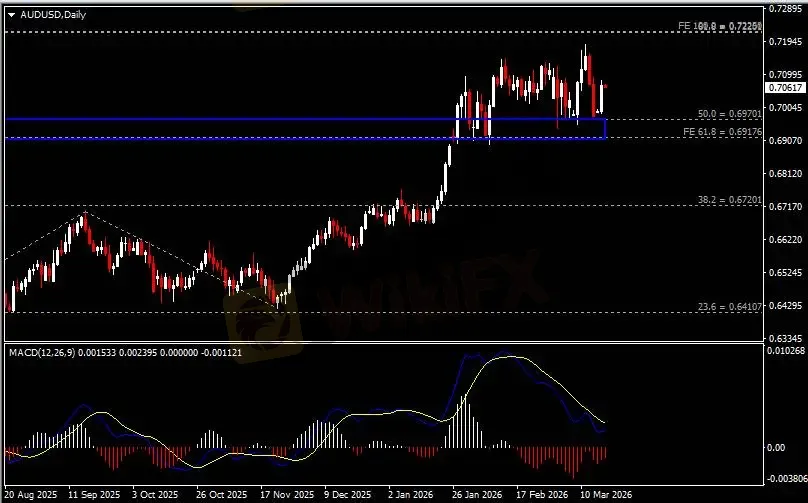 日线图显示澳元兑美元反弹走强,当前收于0.6920-0.6970支撑区域。从MACD来看,快慢线呈拐向,红色动能柱温和收缩。汇价走势基本和动能柱的变化一致。