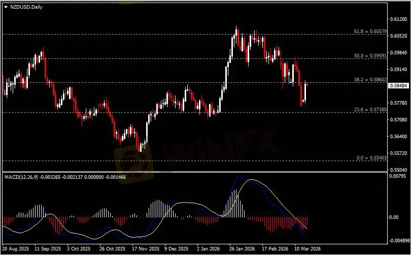日线图显示纽元兑美元反弹上涨,当前回测0.5860阻力。从MACD来看,快慢线呈拐向,红色动能柱温和收缩。汇价走势基本和动能柱的变化一致。