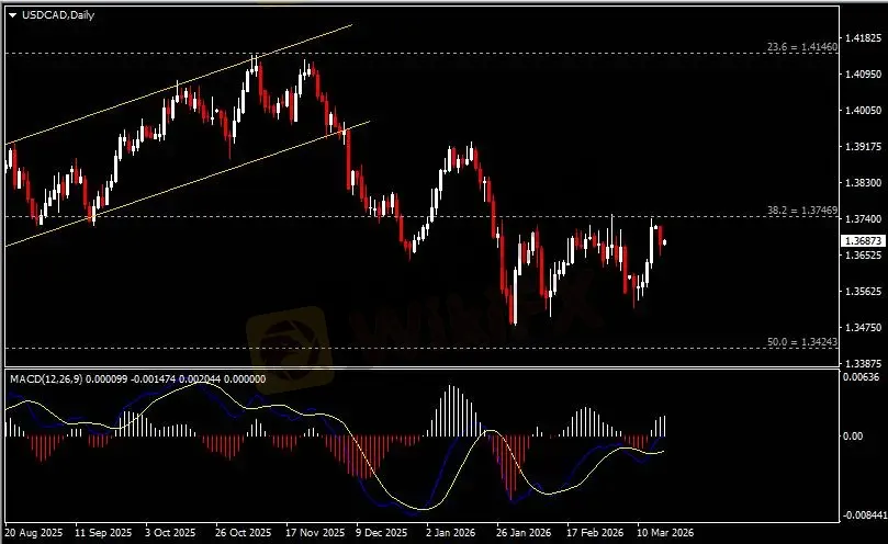 日线图显示美元兑加元回调下挫,当前承压于1.3750阻力。从MACD来看,快慢线向上扩张,白色动能柱温和放量。汇价走势和动能柱的变化呈分歧。