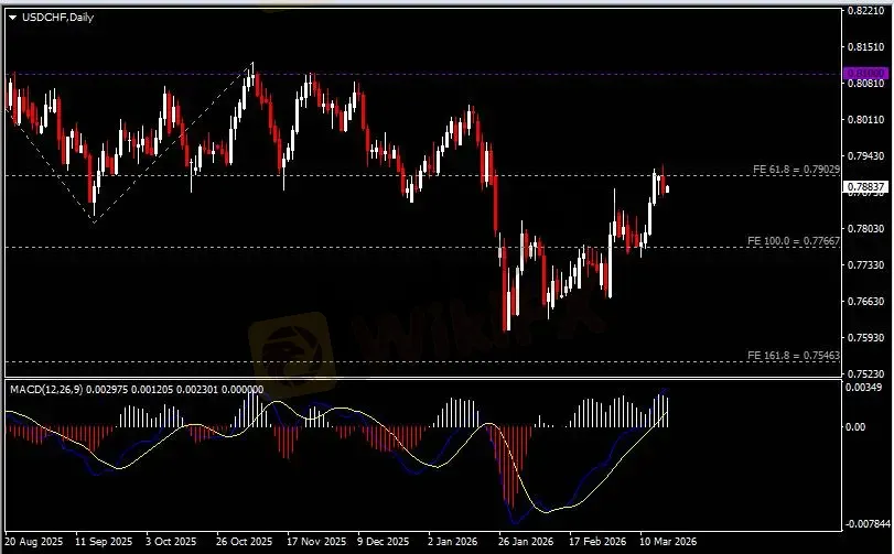 日线图显示美元兑瑞郎高位回调,当前承压于0.7900阻力。从MACD来看,快慢线向上运行,白色动能柱则温和收缩。汇价走势基本和动能柱的变化一致。