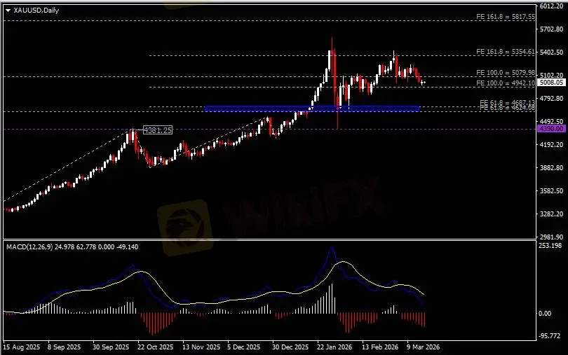 日线图显示金价回调暂缓,当前收于4950支撑。从MACD来看,快慢线向下运行,红色动能柱温和放量。金价走势和动能柱的变化呈分歧。