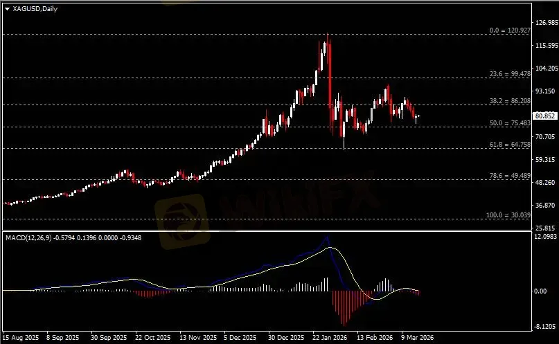 日线图显示银价小幅反弹,当前仍承压于86.20阻力。从MACD来看,快慢线向下运行,红色动能柱温和放量。银价走势和动能柱的变化呈分歧。