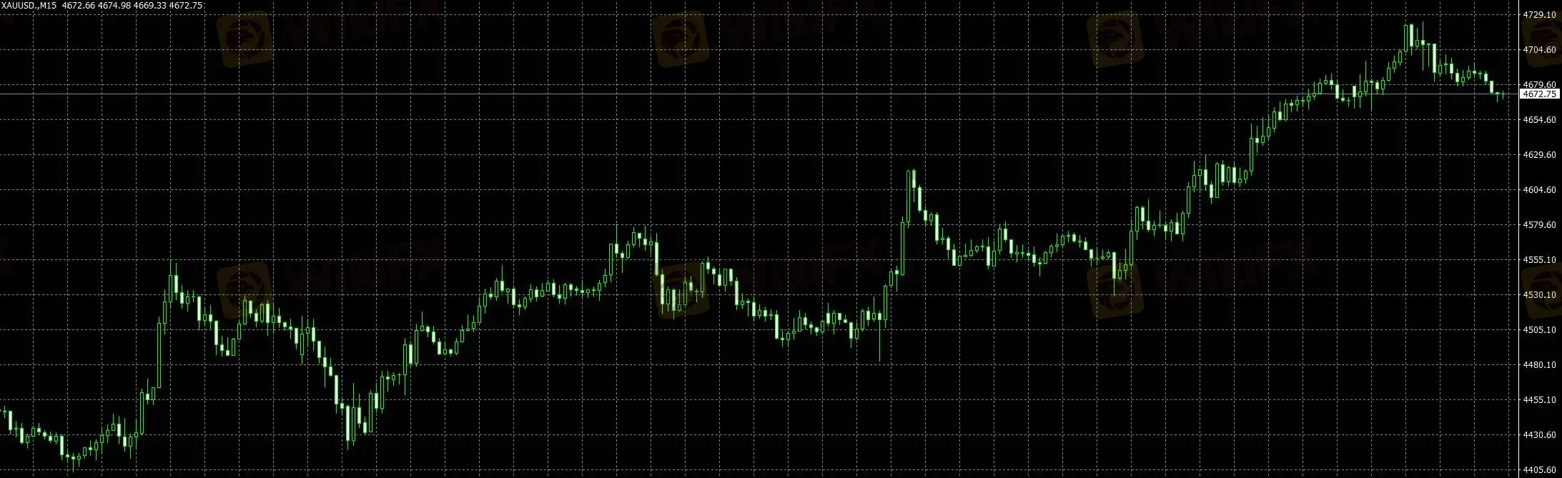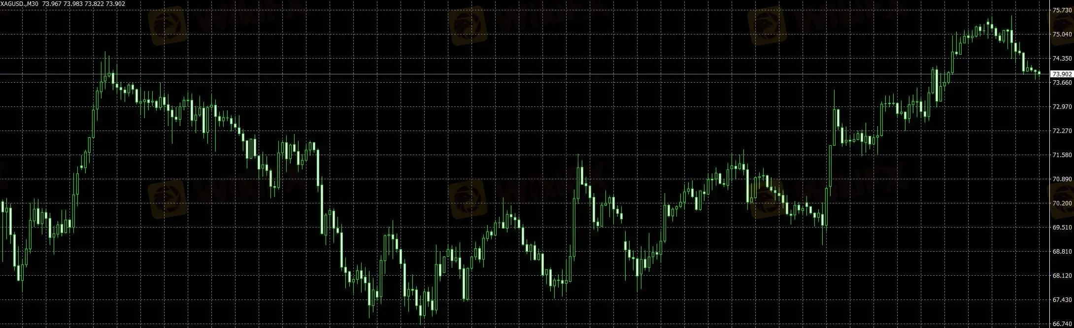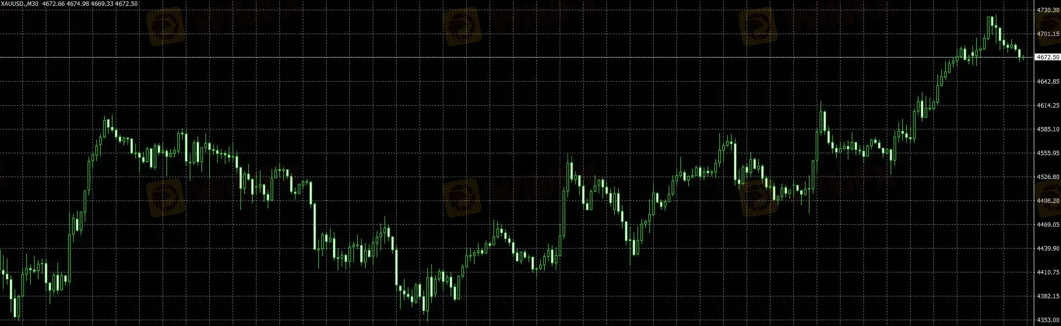 30分钟级别中,黄金呈现典型的冲高回落结构,价格在快速拉升后未能形成有效延续,反而进入横向震荡区间,盘面表现为高位反复拉锯。虽然低点仍有一定支撑,但上涨节奏被明显打断,说明短线多头一致性下降,部分资金开始兑现利润。当前结构更偏向上涨后的动能衰减阶段,若后续无法重新形成连续拉升,则行情容易转入区间震荡。