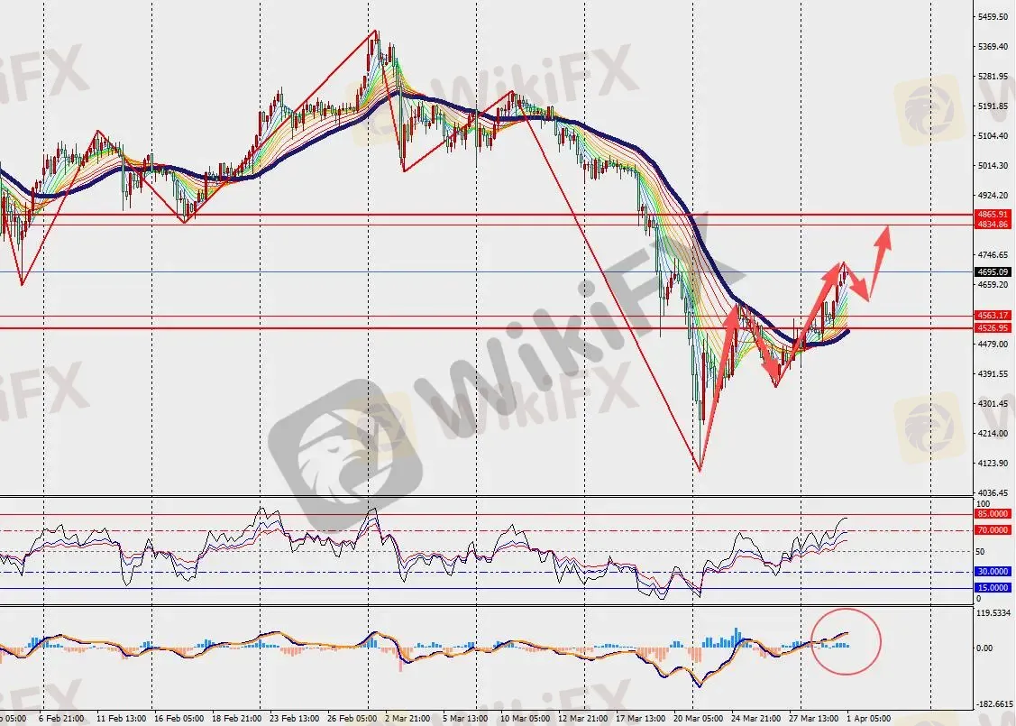 技术面:黄金H4级别震荡反弹,并在48日多空分界线上方运行。然而,MACD双线和量能柱在零轴上方顶背离缩量。若伊朗局势与其他地缘政治热点形成共振,推动全球加速增持黄金并削弱对西方财政可持续性的信心,金价上行空间将进一步打开。