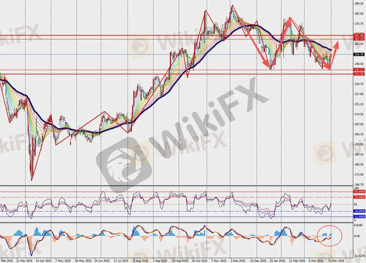 第一阻力位:267.00 第一支撑位:242.00