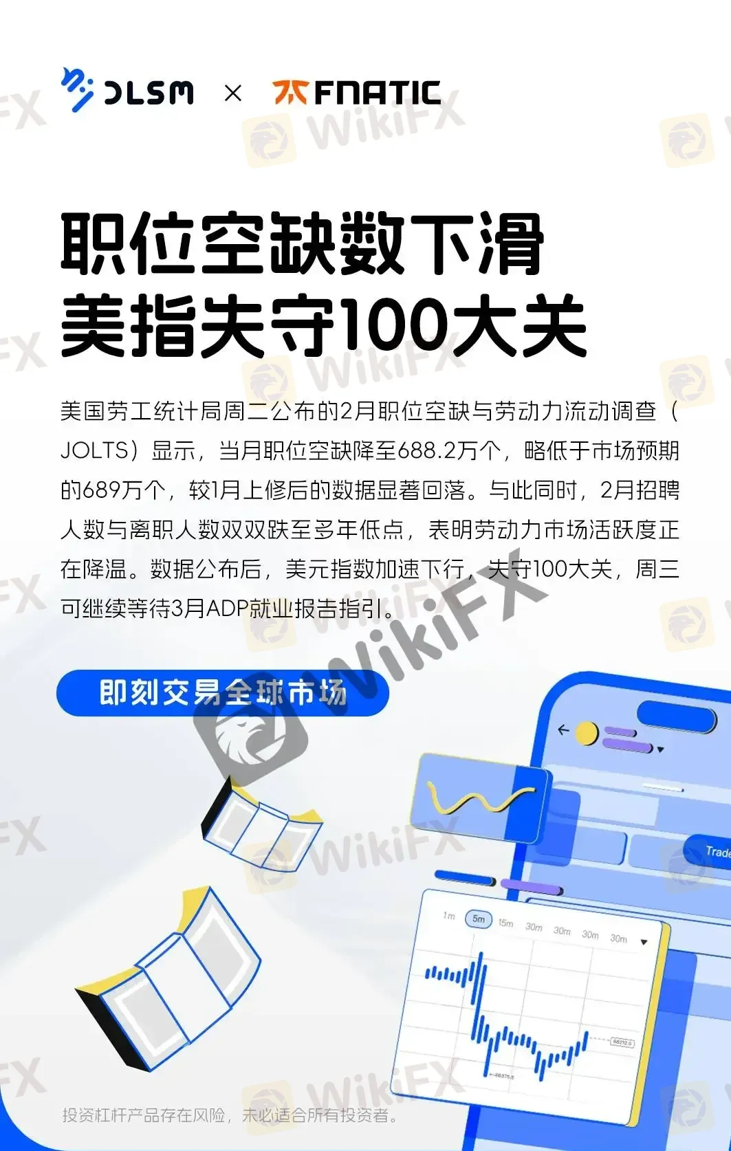 摘要:美国劳工统计局周二公布的2月职位空缺与劳动力流动调查(JOLTS)显示,当月职位空缺降至688.2万个,略低于市场预期的689万个,较1月上修后的数据显著回落。与此同时,2月招聘人数与离职人数双双跌至多年低点,表明劳动力市场活跃度正在降温。数据公布后,美元指数加速下行,失守100大关,周三可继续等待3月ADP就业报告指引。