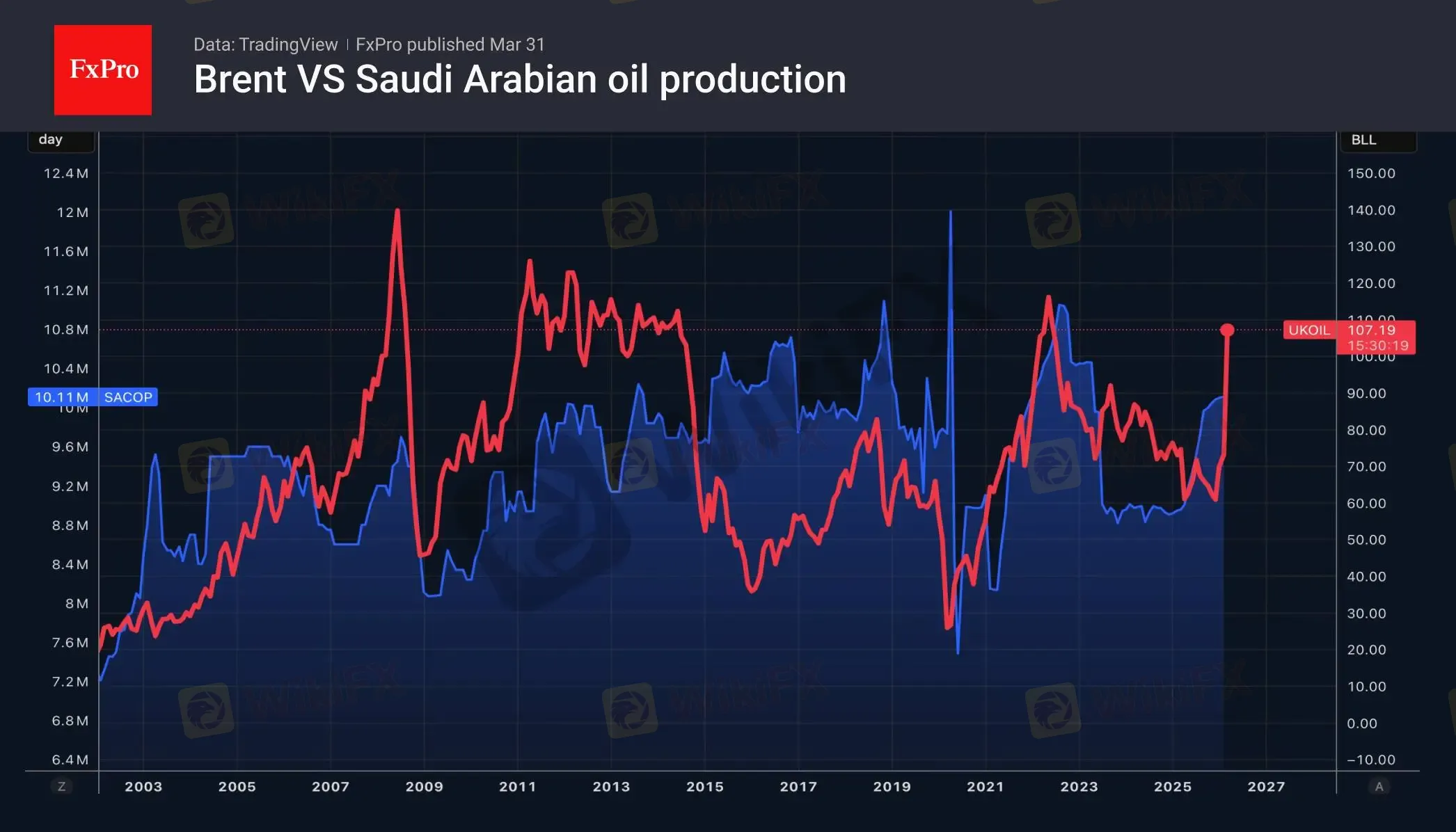 与此同时,根据法国兴业银行的数据,布伦特原油价格在4月份可能升至每桶150美元的风险,平均价格为125美元。胡塞武装关闭曼德海峡可能导致油价进一步走高。沙特阿拉伯已成功绕过霍尔木兹海峡,通过替代路线输送了600万桶/日的石油。然而,新的困难将自动迫使利雅得减产。