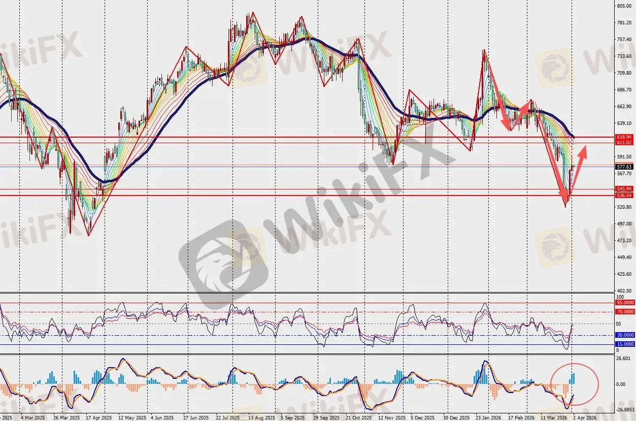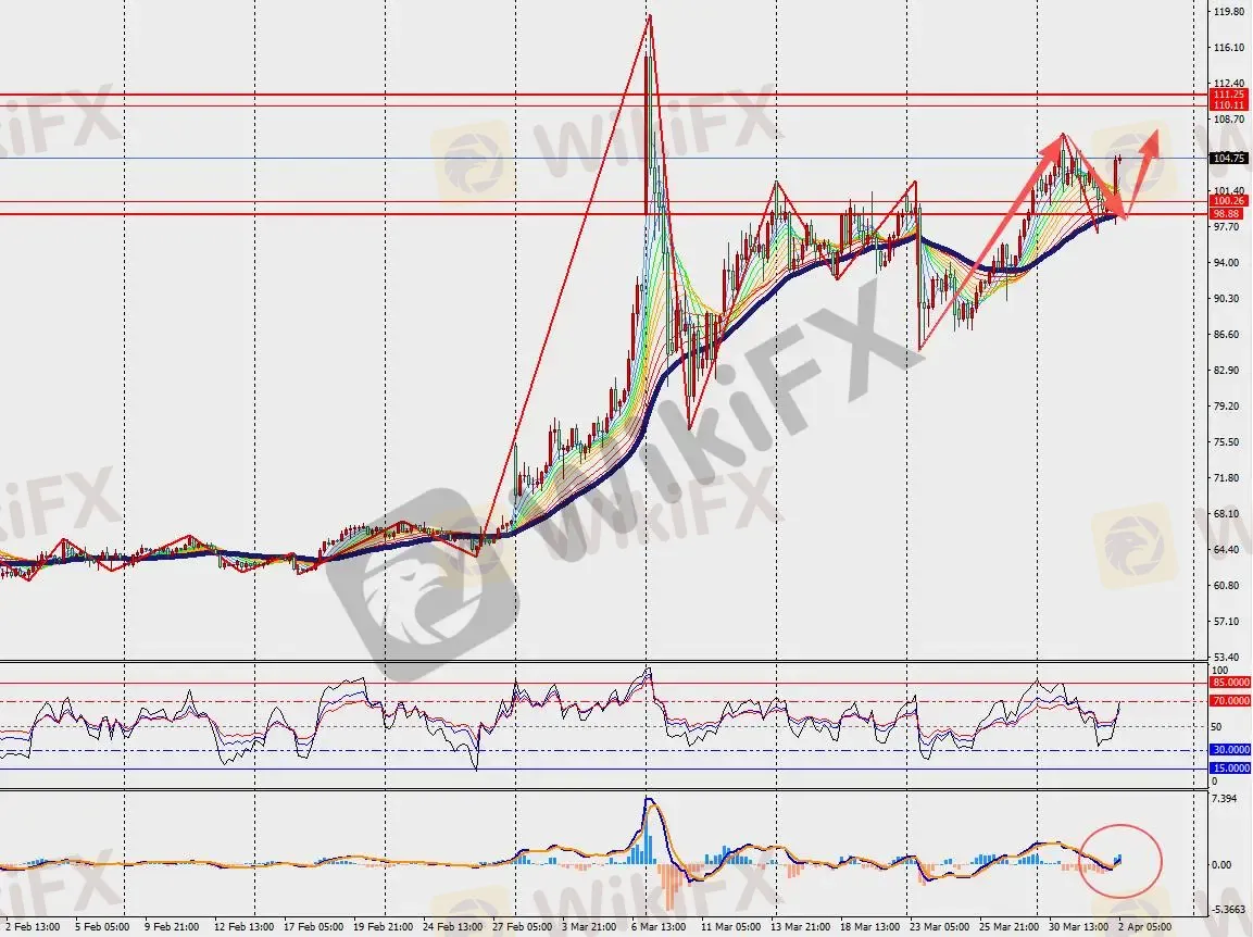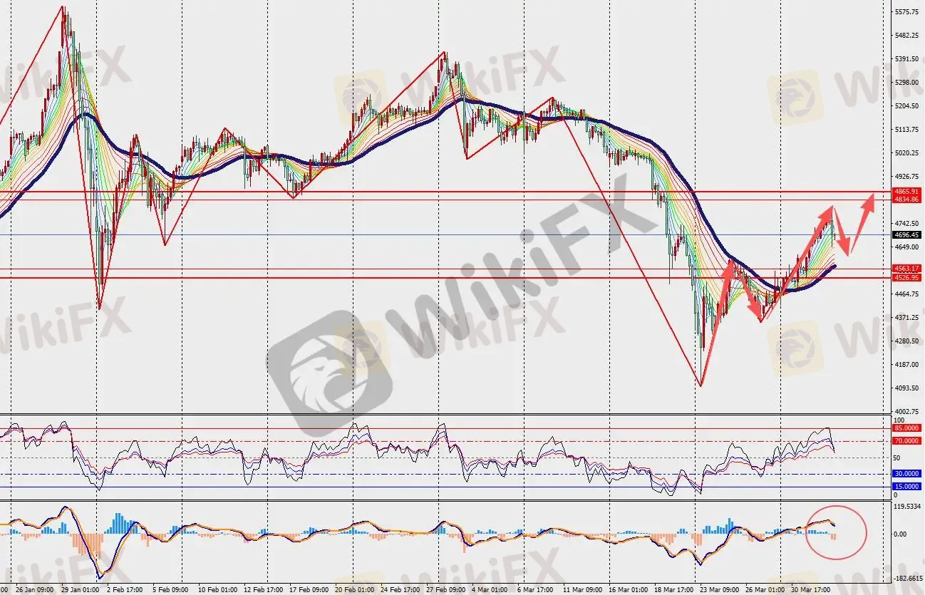 技术面:原油H4级别再次反弹,并在48日多空分界线上方运行。此外,MACD双线和量能柱在零轴附近扩张。OPEC 3月原油产量因海峡关闭下降750万桶/日,美国上周原油库存增幅超预期,而沙特可能将5月对亚洲原油官方售价上调至创纪录水平。