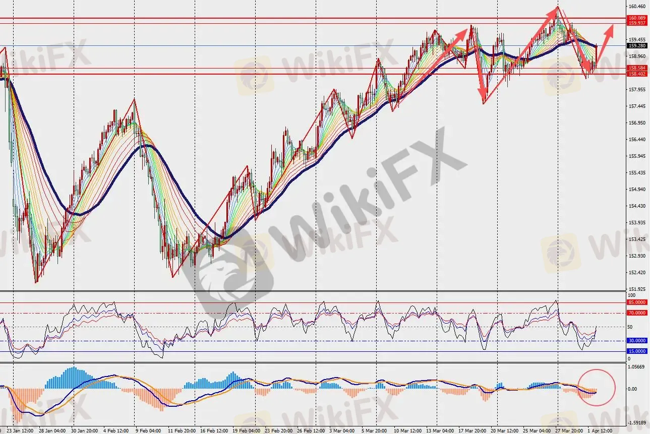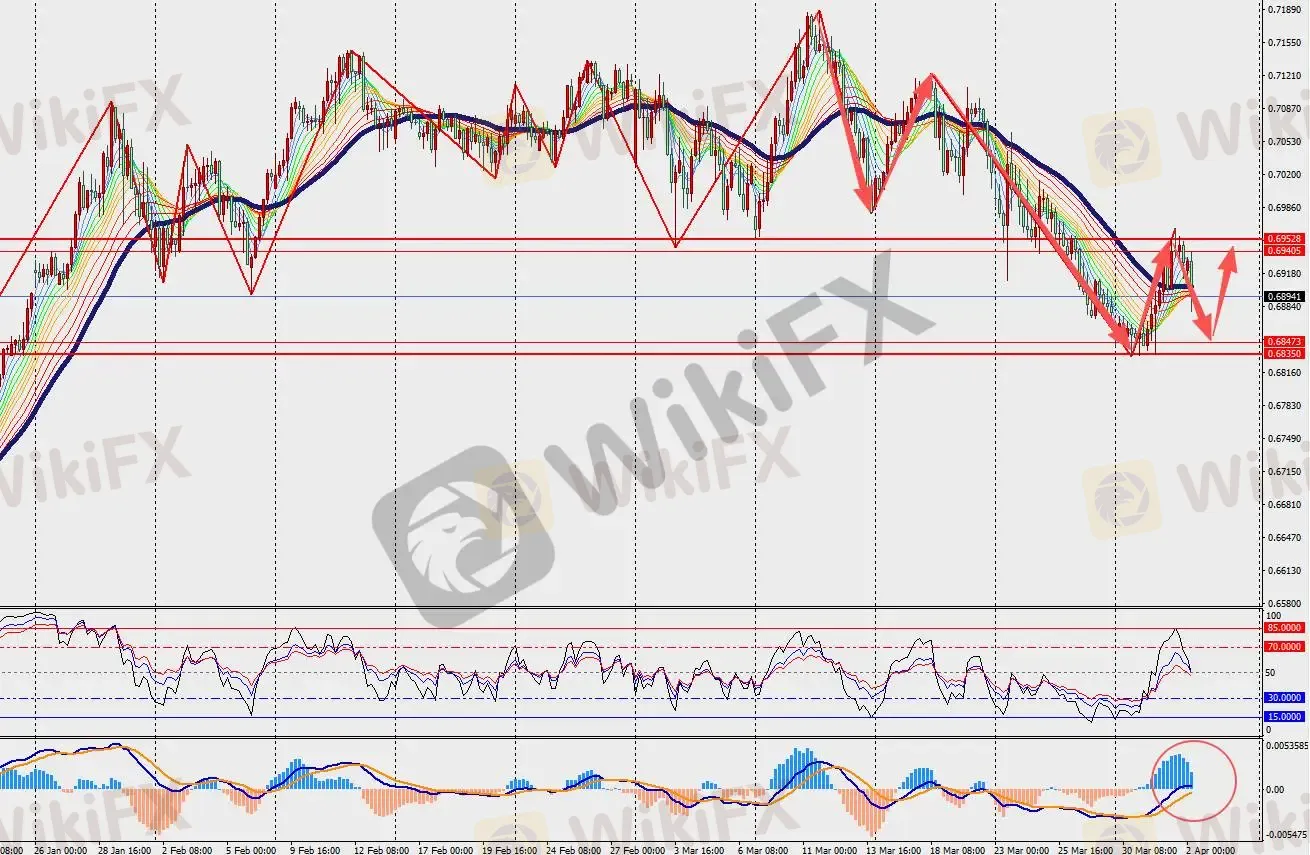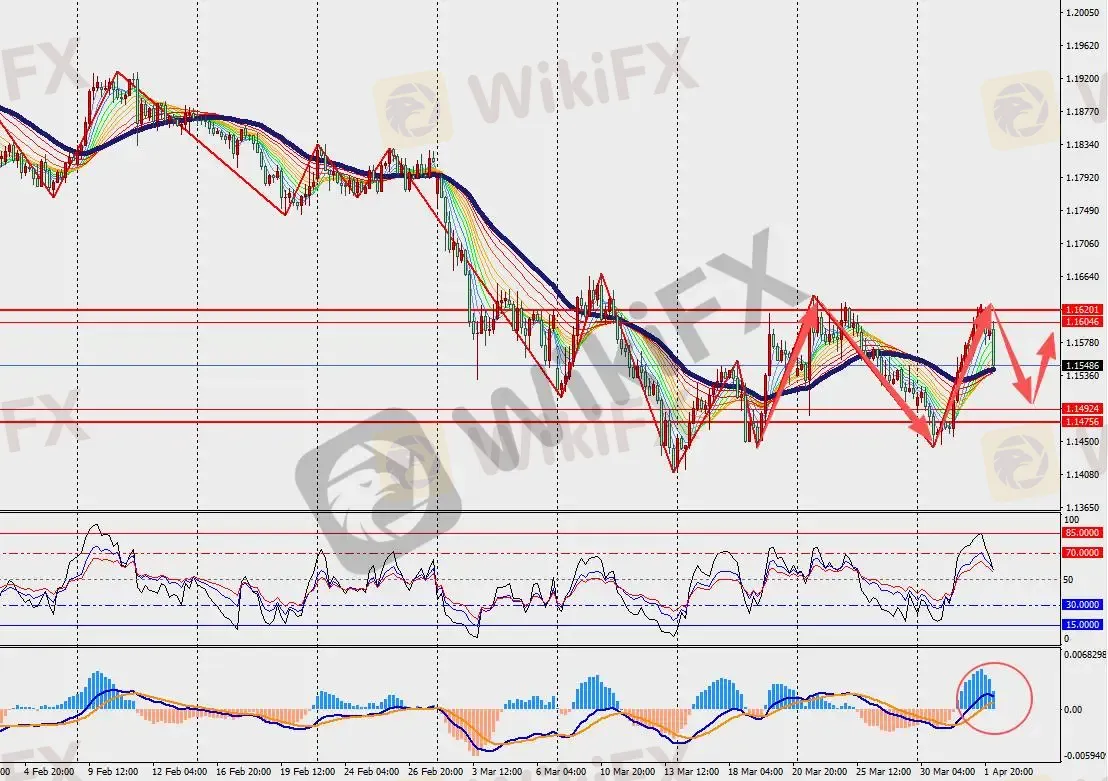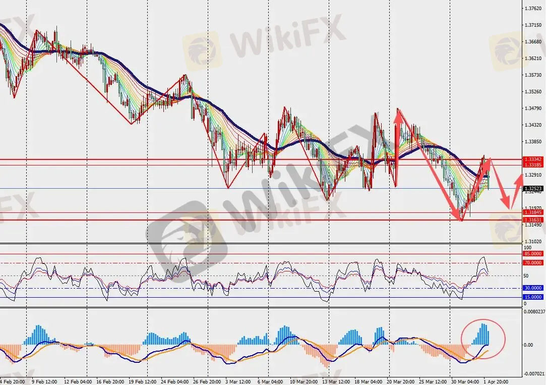技术面:原油H4级别再次反弹,并在48日多空分界线上方运行。此外,MACD双线和量能柱在零轴附近扩张。OPEC 3月原油产量因海峡关闭下降750万桶/日,美国上周原油库存增幅超预期,而沙特可能将5月对亚洲原油官方售价上调至创纪录水平。