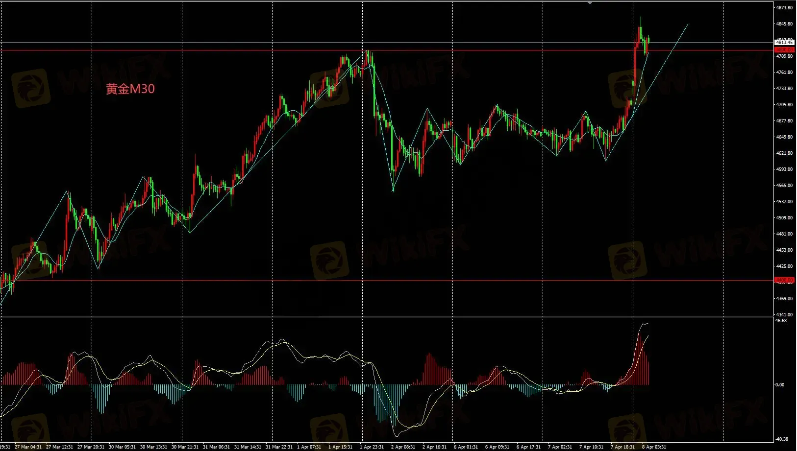 M30图表金价日内逢低买入操作,重点关注金价在4800变动,若如下破该支撑,则多头暂时观望。