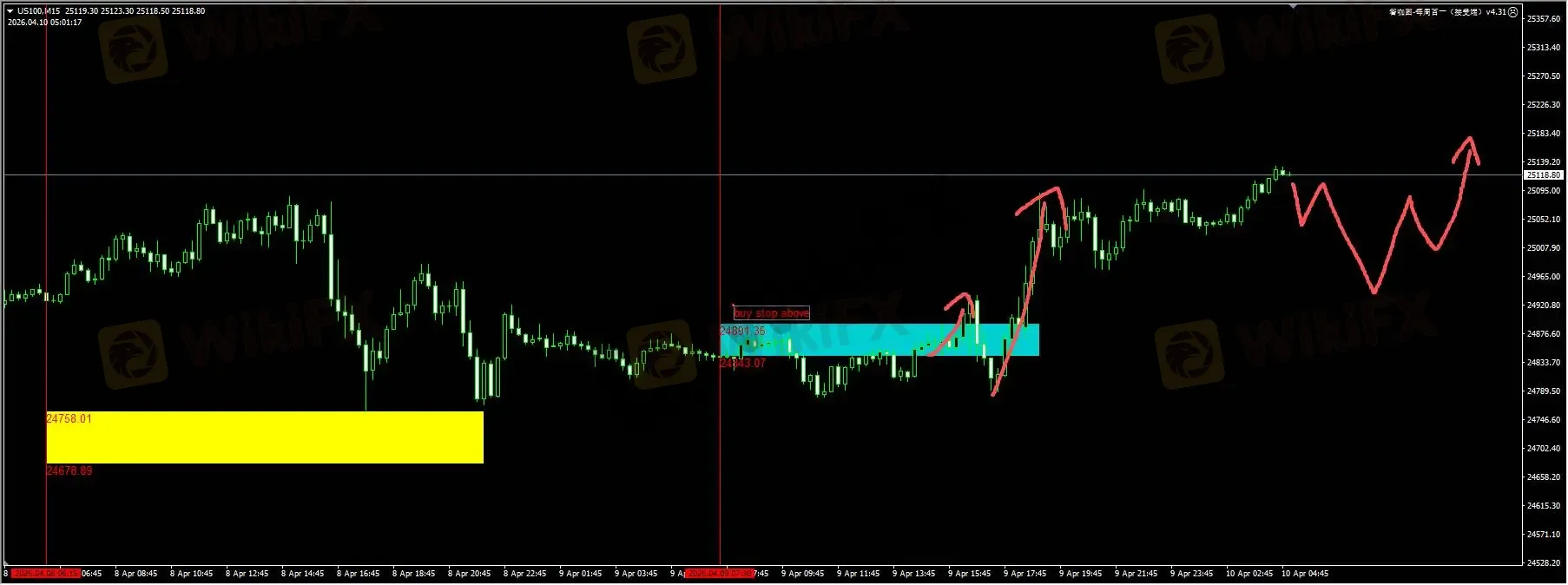 纳指:昨天我们插件提醒的蓝色区域突破后进行buy stop操作。第一次突破出现毛刺,但第二波突破非常有效。日内我们建议暂不追高,等待价格回扫25000附近确认之后才重新开始捕捉多头信号。详细位置请咨询插件。