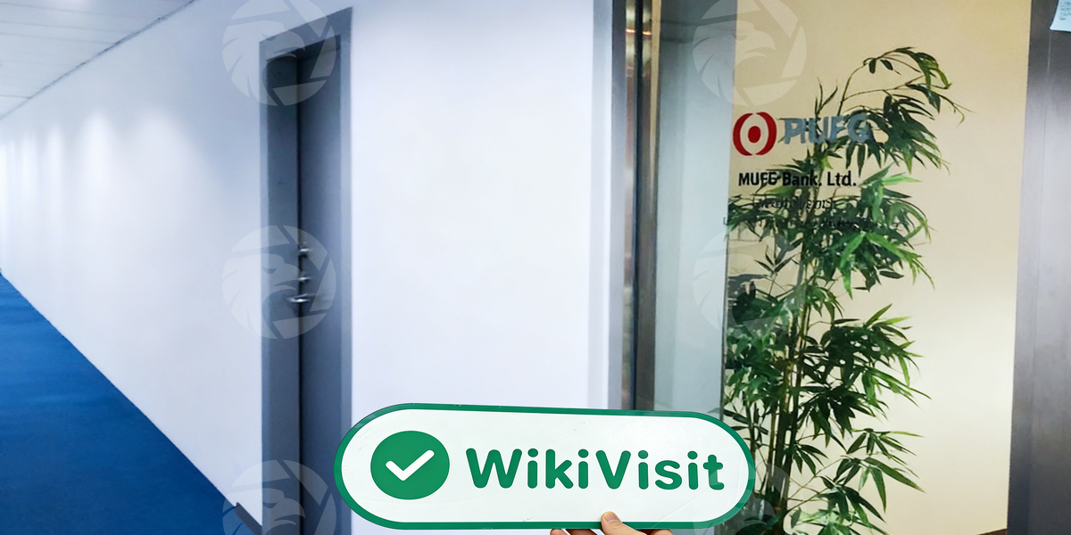实勘人员进入大楼,乘坐电梯到达了12楼,三菱日联金融集团拉布安分公司的logo以及枝繁叶茂的一盆绿植进入了实勘人员的视线。