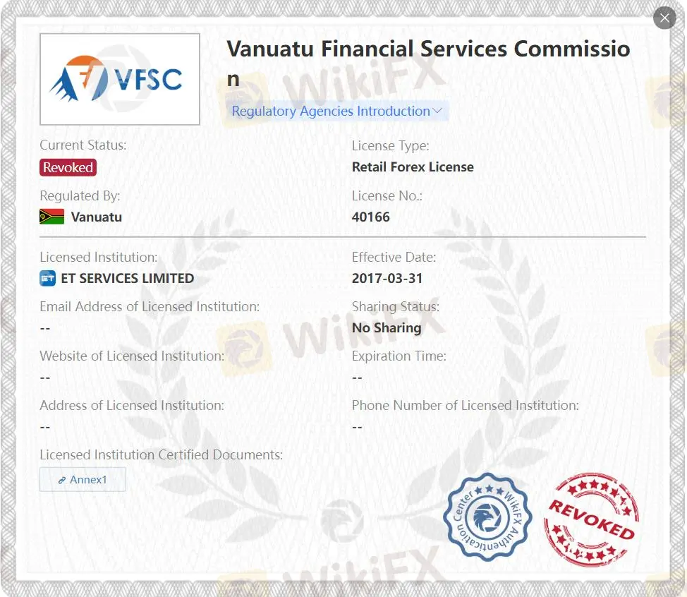 目前,編號 ETFX 沒有有效的監管規定。它只持有兩個被撤銷的監管許可證。請注意風險!