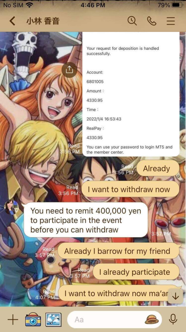 the broker was scammed my money I was withdraw in the site because the manager won’t let me to withdraw then I try to there site first it always failed then I talk to the manager how to get my money back then she told me to participate the event then deposit 500000yen then I’ll do to get all my money back when I was deposit the manager won’t reply to and I try to withdraw to there site I’m shocked because I was withdraw all my money but when I check the back account there’s no moneys enter