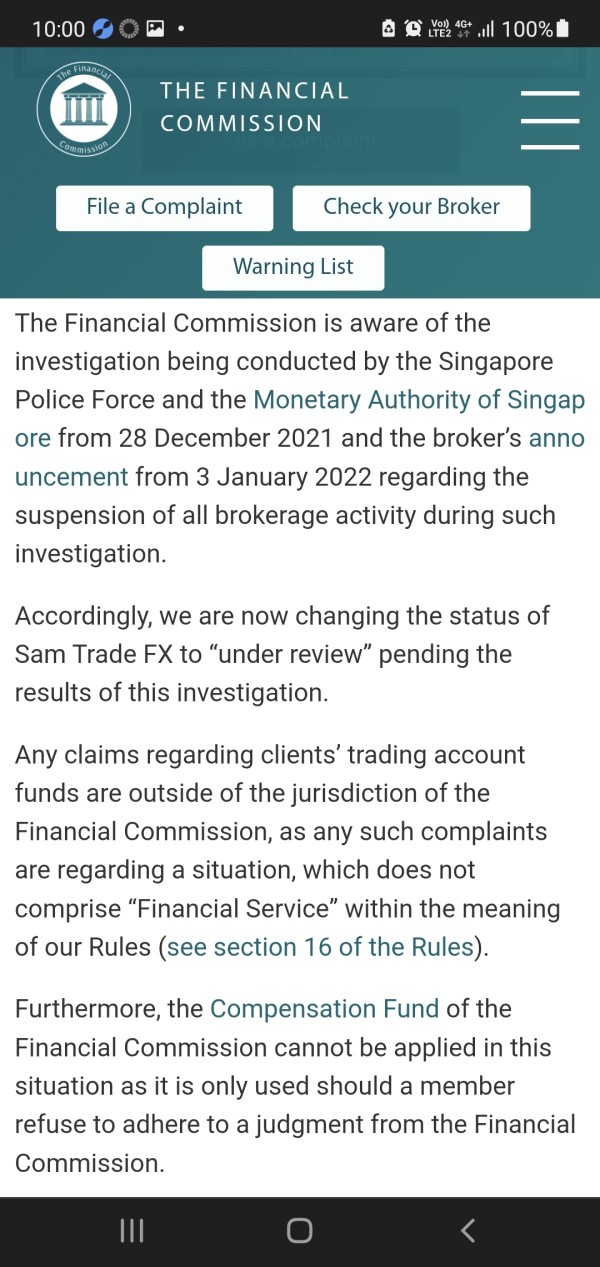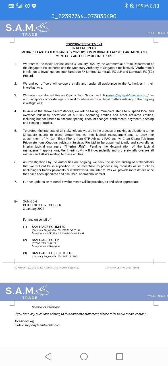 i can't make withdrawals with no information for how long. Samtrade FX have stopped all operations for now. Please help. Referring to a media release dated 3 January 2022 by the Commercial Affairs Department of the Singapore Police and the Singapore Monetary Authority (collectively the "Authorities") in connection with investigations into Samtrade FX.