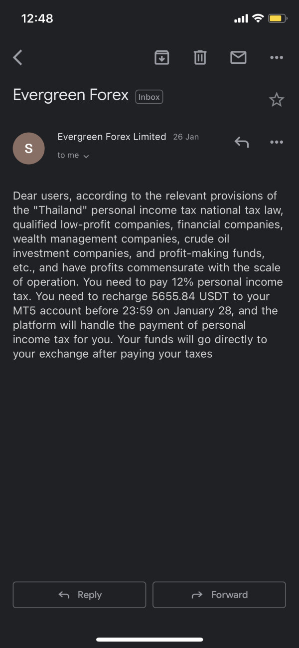 ตอนแรกบอกให้ฉันจ่าย10%จากยอดเงินที่ฉันเล่นได้ โดยต้องเติมเงินเข้าพอตเท่านั้น ไม่สามสรถหักจากเงินที่ฉันหาได้ ฉันก็หามาจ่าย เสร็จแล้ว พอฉันต้องการถอนเงินออกทั้งหมดก็บอกว่าต้องเสียค่าภาษี 12% ฉันก็หาเงินมาจ่าย เสร็จแล้วตอนนี้บอกให้ฉันจ่ายค่าธรรมเนียม ซึ่งฉันขอให้หักจากเงินที่ฉันต้องได้ เขาบอกไม่สารมารถทำได้ ต้องจ่ายเองเท่านั้น ฉันขอยกเลิกก็ไม่ได้ ขอเปลี่ยนธนาคารก็ไม่ได้ ตอนนี้เงินของฉันก็ยังไม่ได้ และก็ยังไม่ถูกคืนเข้าพอตของฉันเลย ยอดทั้งหมด 47132.00 USDT