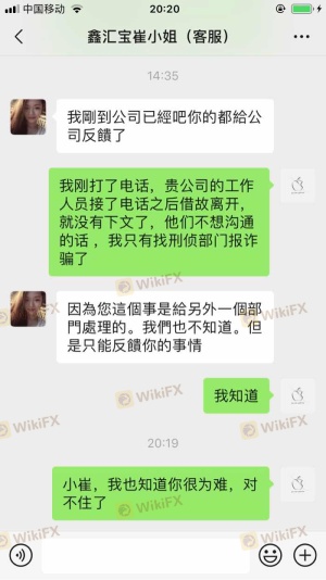 香港鑫匯寶貴金屬有限公司系黑平臺,他們采用虛擬交易的方式欺騙客戶造成虧損,資金沒有進入市場,入金賬戶均為私人賬號,交易軟件也是平臺后臺隨便能調節的,客戶虧錢是絕對的。受害者根據他們的客服電話找他們理論,起初還接電話,聲稱他們平臺沒有問題,后來再打電話,干脆就不接了,還刪除了受害者交易賬戶。