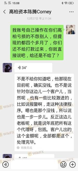 曝光平臺:高柏資本 帶單方式:一對一喊單、群喊單,直播間喊單 2019年8月初,有人推薦免費帶大家炒股的股神。然后推薦我進入了一個群,里面有老師。帶著大家做股票。其中助理帶我注冊了高柏資本,每天晚上進直播間講課,分析和選股。做了一段時間,市場行情不好,于是,老師們商量,承諾帶大家回本,保證收益,提出帶著大家做a50,要求大家必須在高柏資本開戶。統一行動,要有執行力,必須跟隨老師的指令買賣。按大家的資金量(在平臺上入金的金額)分配老師。 8月16日,我看群里有幾個人說賺了錢。還曬了單子。我也入3萬美金,跟著老師操作。當天老師帶了幾單,賺5000來美金。8月18日,老師通過V信喊單。操作了幾筆。又賺了幾千美金。事情的轉折出現在,4月20日晚上。本來我不想再操作了。老師要求必須跟上老師的指令。老師不斷地要求我們加倉。在行情反轉的時候,要求我們繼續持有。當天晚上把8月27日和29日賺的部分虧完了。我們虧了,老師說,是什么非農行情,虧了一點,改天賺回來。 9月5日晚上,老師在直播間說要帶我們本周翻3倍做大行情。他說高柏資本低開,必然要上漲。叫我們大家下單買多。然后又不斷要求我們加倉,在他的要求下先后加了3次倉。其實,中間小漲了一點。然后就是一直下跌。他還是堅持叫我們加倉買多單。接著繼續大跌,大虧。然后,老師宣稱,要求大家買進多單。我又跟著買進,結果,買進去還是跌。老師卻下了直播,不管我們了。當天虧到了不到2000美金。短短的幾天,我的5萬美金基本上虧損完了。我徹底的絕望了。于是想把剩下的錢全部轉了出來,結果平臺確以各種借口推脫不讓出金