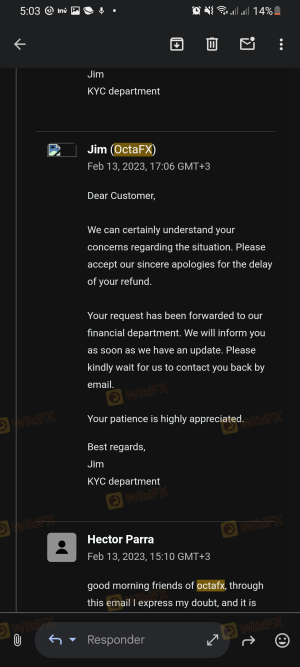 我叫張秀英。 由于付款問題,押金延遲了,這筆押金必須從octafx退還給我。 他們推遲退款已經持續兩周了,我很不開心。我本來很期待退款因為他們很快回應了,但只是要我等著。我不知道他們是不是真的會退還我的押金 。