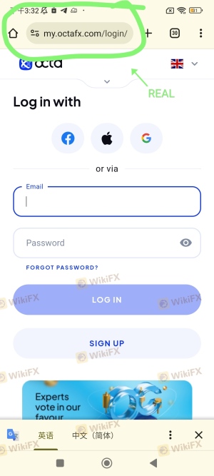 各位交易員小心這個網站,它假冒octafx官方來讓你們用官方帳戶登入或讓你們註冊。如果用你們官方帳戶登入可能資金會被盜或對你們帳戶做一些不好的。這個假網站做的跟官方網站一樣,下方連結的社交平台和軟件都是官方的,和官方網站一模一樣。只是它沒有主頁。而官方有主頁。有圖片為證據。如果要註冊或登入要用官方的網站或軟件。這個連結是官方的https://www.octafx.com/