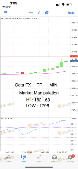 OctaFX是黑交易商之一,當實際價格從未觸及該標價時,他們操縱價格,我附上我的交易截圖,看看市場價格在哪里,他們故意黑掉我的sl,這必須受到懲罰..我應該拿回我的收入.. 即使我附上了兩個圖表的截圖,即一個 oanda 和另一個 forex.com 的相同日期和時間。例如,在 2022 年 9 月 28 日,時間 16:48,你會發現市場處于 1642 點,即使是在 16:50,但請看 OctaFX那天和時間交易的截圖,他們黑了我的sl,它是 1656.. 左右?同樣,我有多個交易可以顯示..然后我停止了 OctaFX他們應該被停牌,他們應該糾正他們的系統,并為此補償客戶。如果我沒有收回資金,我會將此事上報給消費者論壇、印度儲備銀行和每個主管部門。他們應該為此受到懲罰。