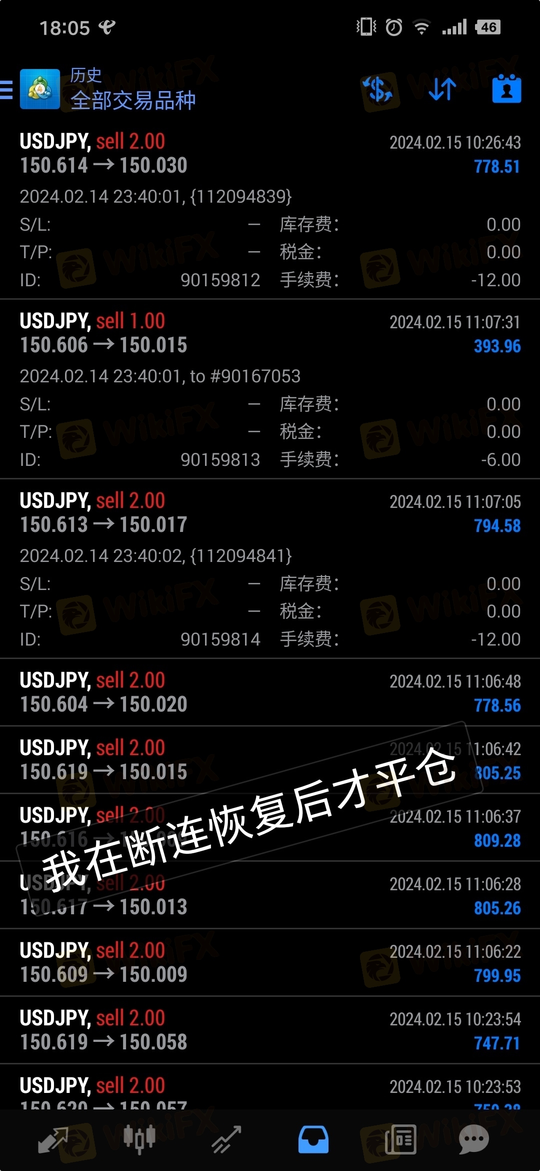 我在2月14号做空美日,在下跌趋势中我还想拿两天,但是有半天时间连不上服务器后,15号用手机草草平仓了。