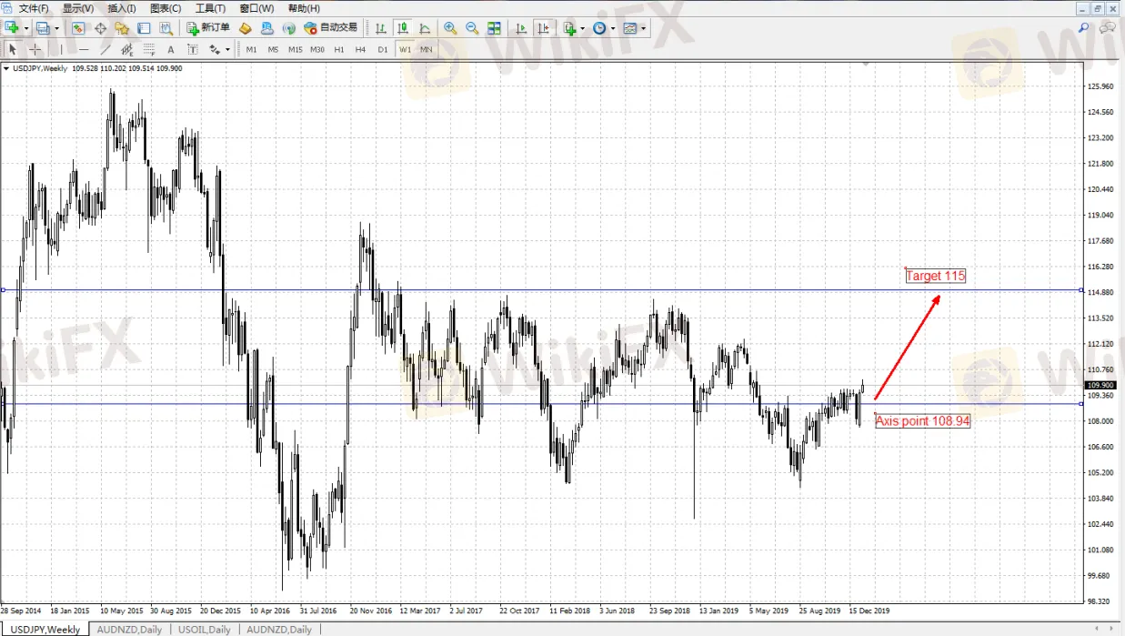 美元對日元上半年的軸心點位於108.94。隨著中美貿易談判取得進展等,全球經濟將趨於穩定,日元有望繼續走低至115一線的位置。