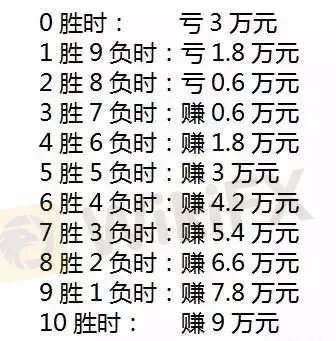 報酬/風險比和獲勝率之間具有緊密的聯繫。假設交易者有10萬元的本金,始終選擇報酬風險比為3:1的行情滿倉做10次,同時設止損位為買入價的-3%(盈利目標為買入價的9%),那麼: