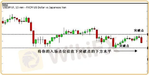 假設投資者預計美元將走低,特別關注的美元/日元可能出現的下行突破行情。此時較為合理的策略是,將入場點位設在下突破點一線下方水準。