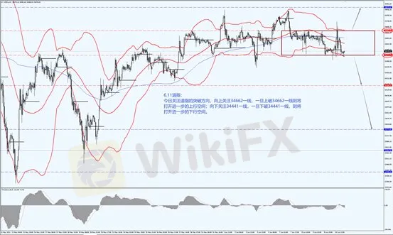 今日关注道指的突破方向,向上关注34662一线,一旦上破34662一线则将打开进一步的上行空间;向下关注34441一线,一旦下破34441一线,则将打开进一步的下行空间。