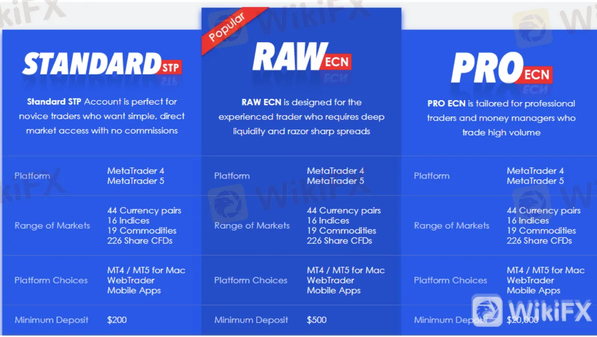 Vantage FX平台提供三種交易賬戶可供選擇:Standard、Raw和Pro賬戶,開立標準賬戶的最低存款要求為200美元,符合行業標準。專業賬戶需要20,000美元的相對較高的存款,這似乎是為經驗豐富的交易者設計的,可以嘗試一下。