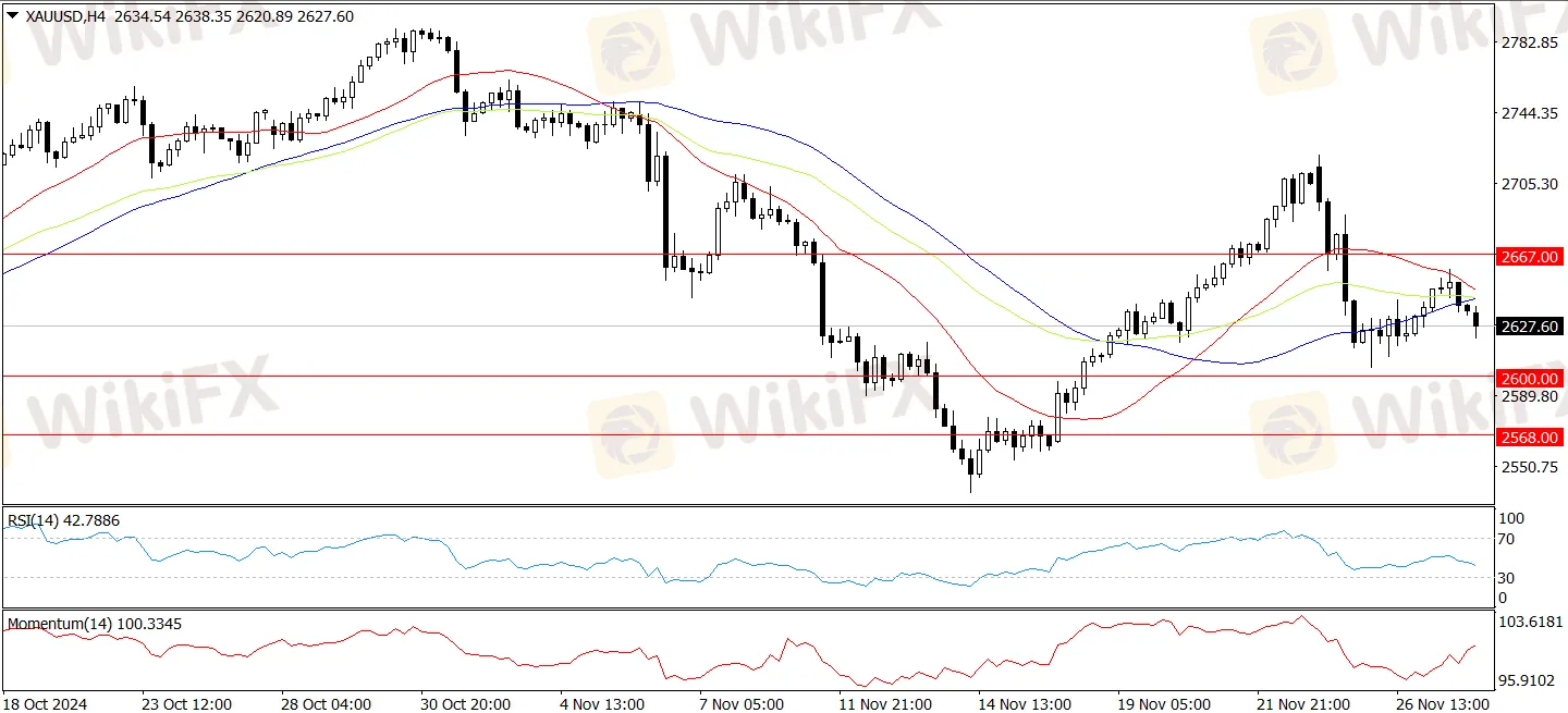金價從日高回落,空頭占據主導地位,進一步下降的風險加大。下降的主要原因是美國個人收入的增加。數據顯示,10月美國個人收入環比增長0.6%,高於預期的0.3%。消費者收入增加後,可能更能應對高通脹,從而降低美聯儲大幅降息的可能性。美國第三季度修正後的GDP增長維持在2.8%,略低於第二季度的3%。不過,報告顯示經濟依然強勁,過去九個季度中有八個季度GDP增速超過2%。週四早晨,現貨黃金從高點2638.50美元/盎司急跌至2621.08美元/盎司的低點。